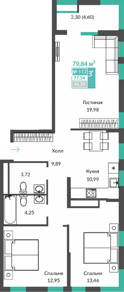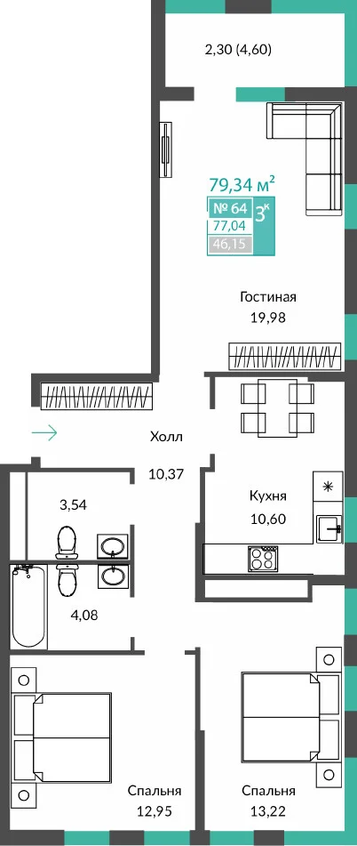 3-комнатная  77.54 м2