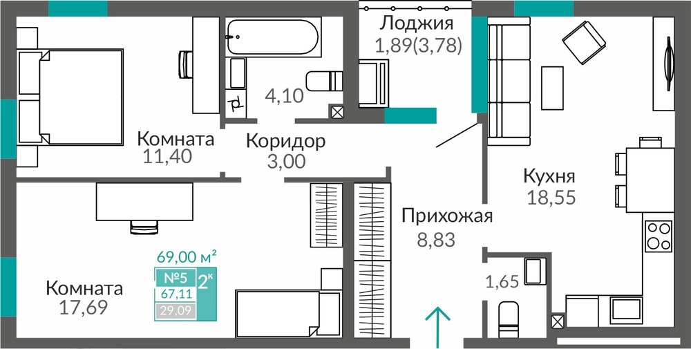 2-комнатная  68.58 м2