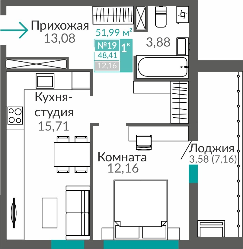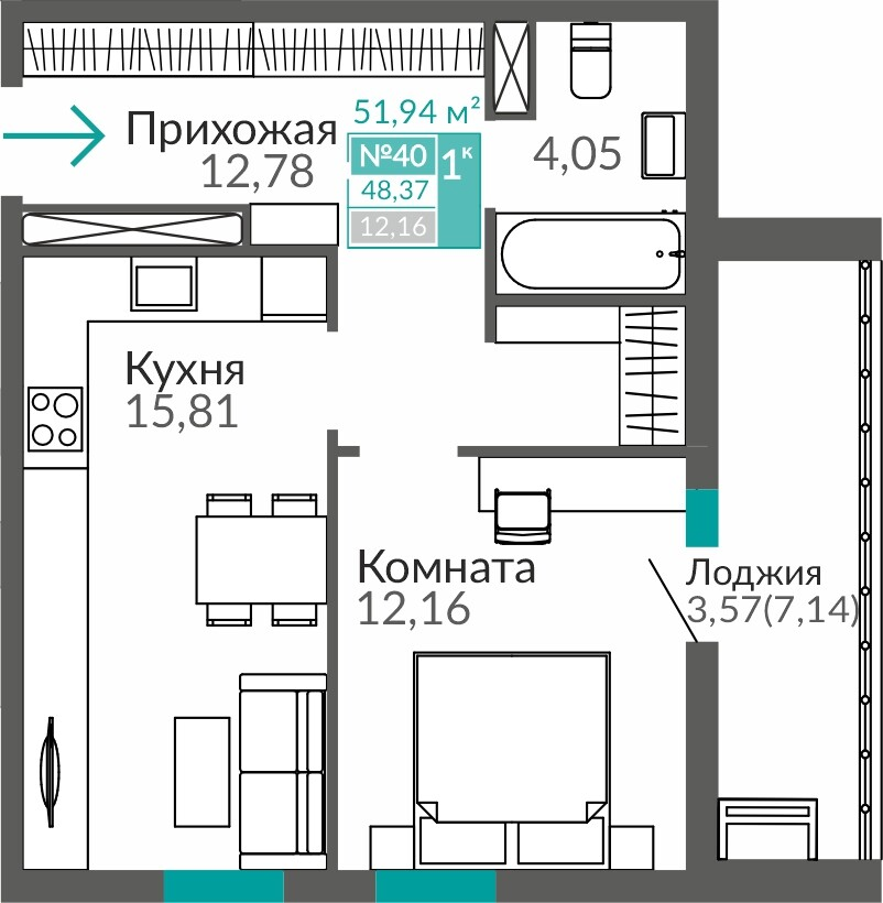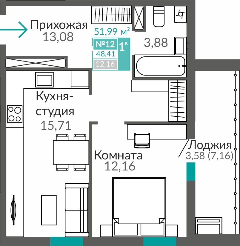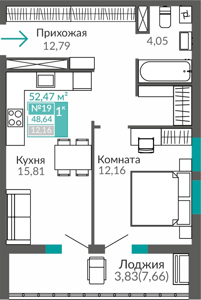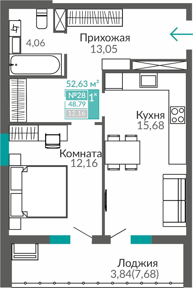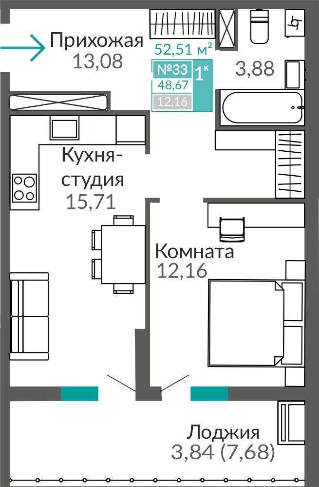 1-комнатная  48.67 м2
