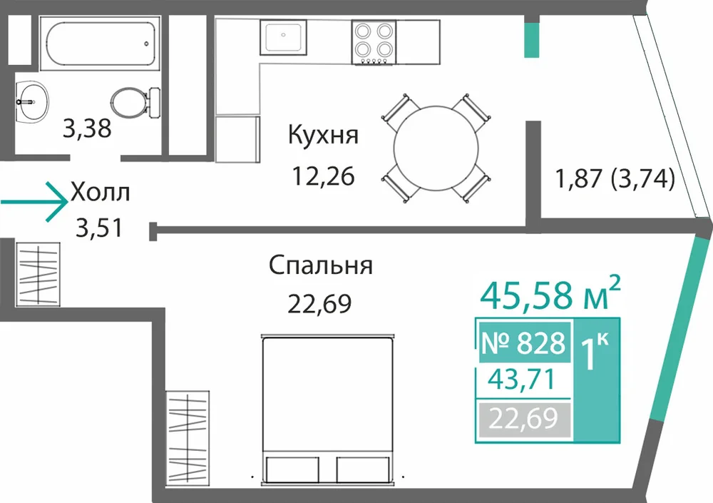1-комнатная  43.71 м2