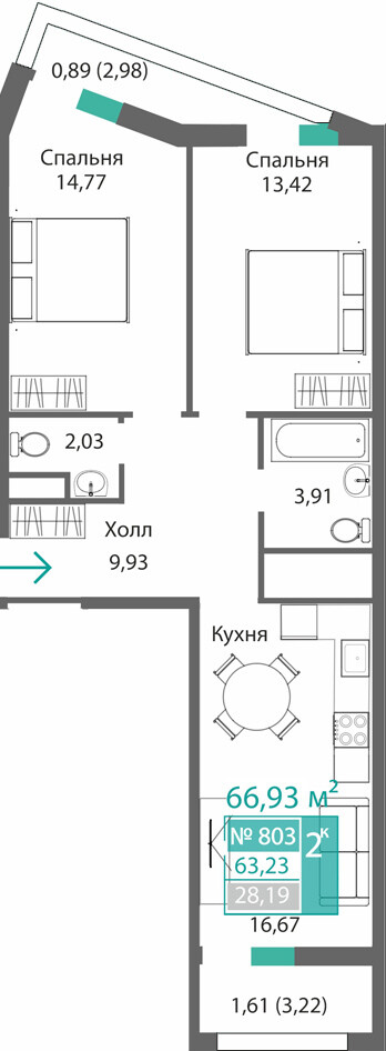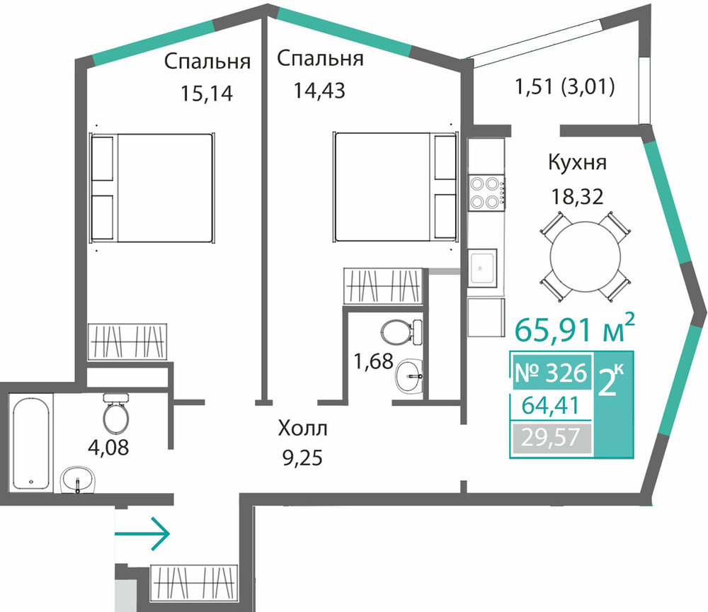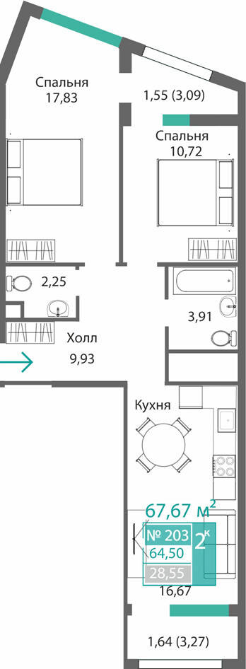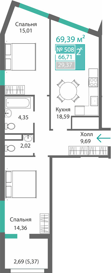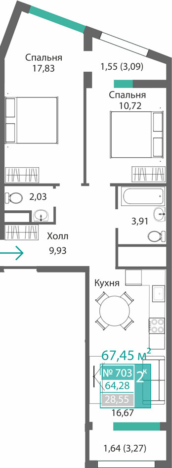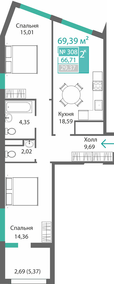2-комнатная  62.4 м2