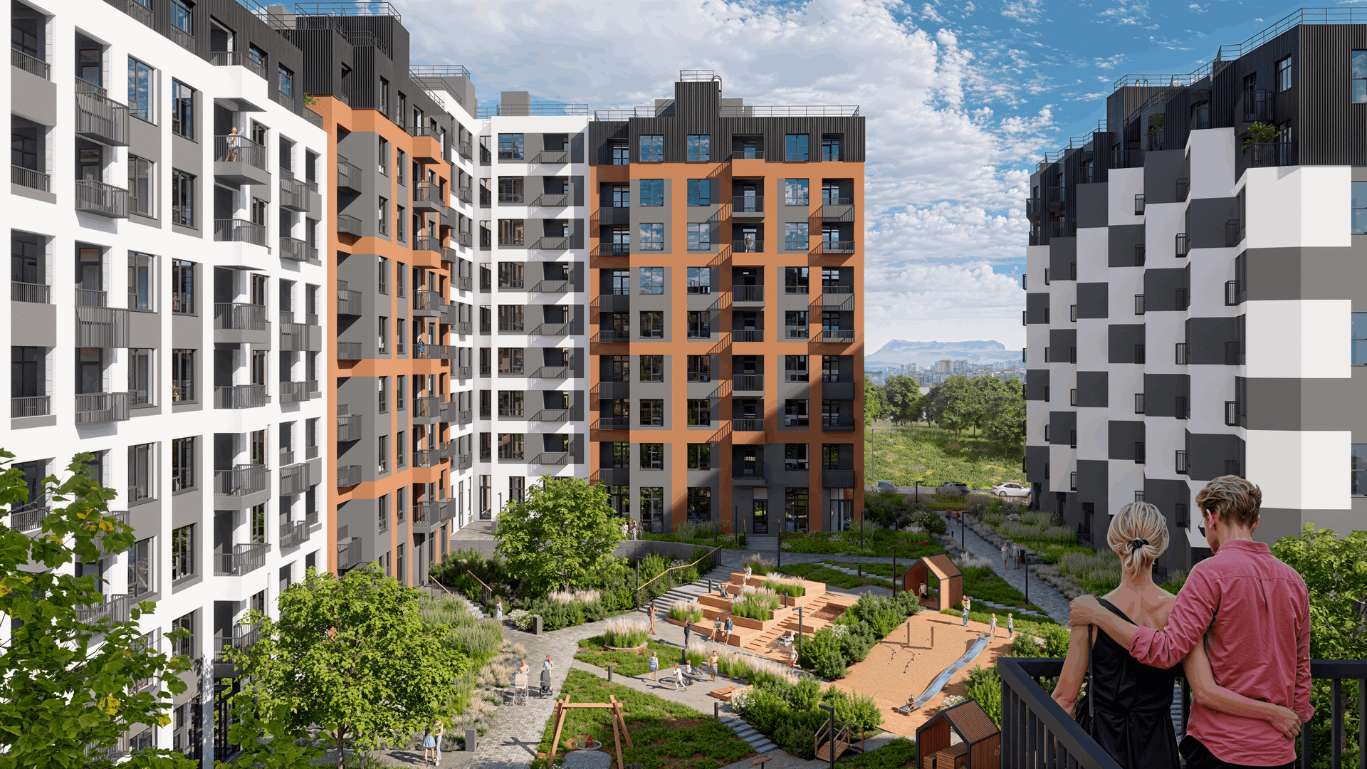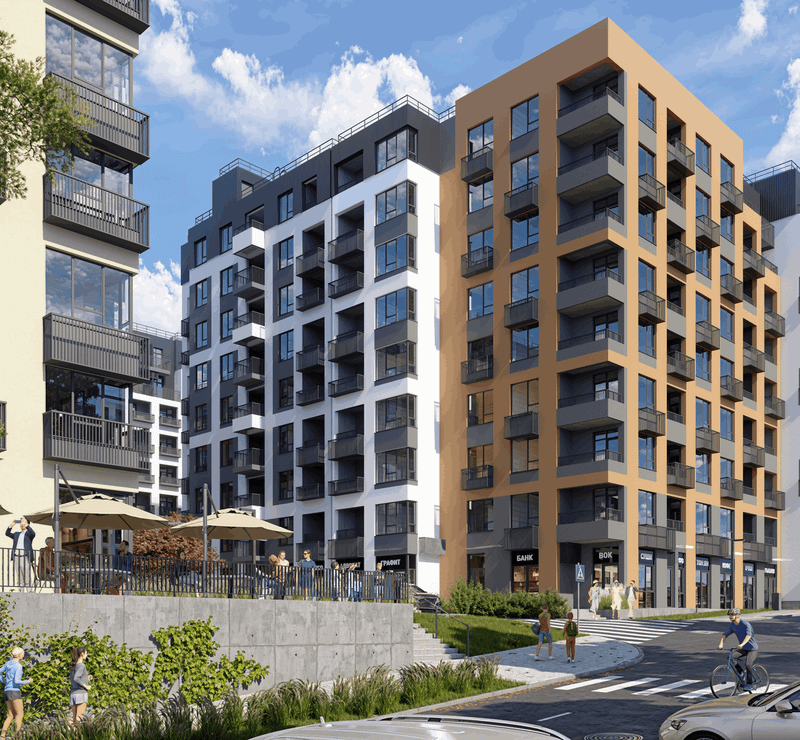 В новом квартале «Крымская Роза» реализуется концепция mixed-use для комфортной повседневной жизни. На первых этажах предусмотрены квартиры с собственными двориками и коммерческие помещения со стороны улицы.