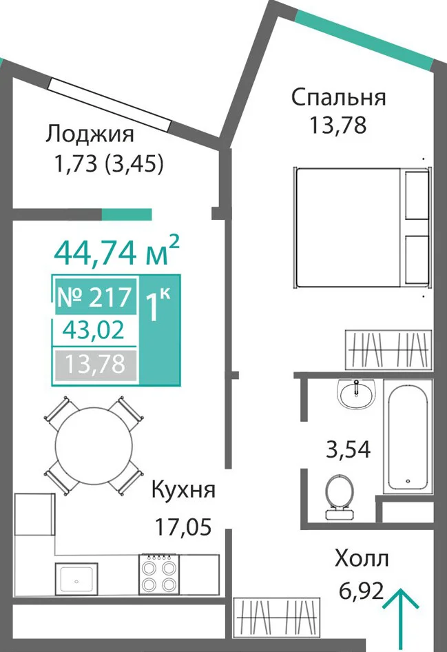 1-комнатная  41.99 м2