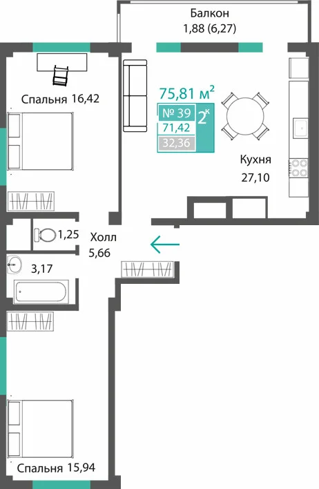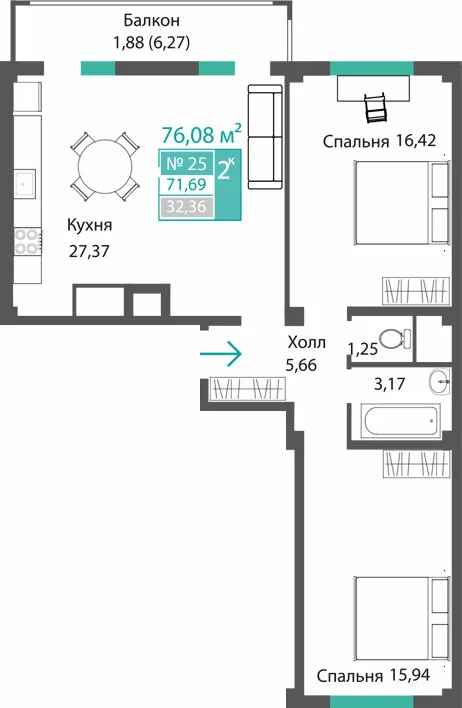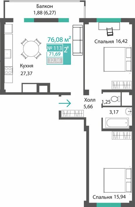 3-комнатная  71.98 м2