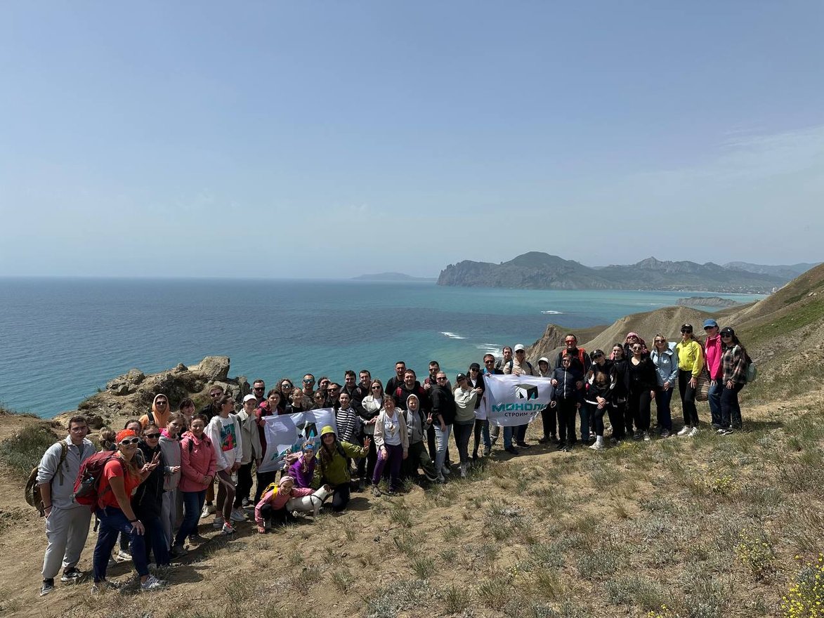 В субботу, 17 мая, сотрудники ГК «Монолит» отправились в поход по живописному горному маршруту восточного побережья Крыма. Стартовал маршрут в поселке Орджоникидзе, где группа туристов поднялась на крутой склон горного хребта. Подъем оказался нелегким и ветреным, но на вершине путешественников ожидали потрясающие панорамные виды на живописную бухту Провато.